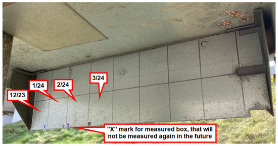 To accurately assess the local conditions of evaluated structures, it is essential to identify a method that can determine the deposition of chloride ions on surfaces where traditional methods are inapplicable. One of the motivations for evaluating the efficacy of the Bresle method is to identify appropriate techniques for quantifying deposition rates on specific elements of bridge structures where conventional wet candle measurement techniques are inadequate. One such example is the overhanging end of the bottom flange of a box girder, as shown in Figure 16. This is an example of a structural detail for which there is a lack of consensus regarding the impact of chlorides on the service life of the bridge structure [20].