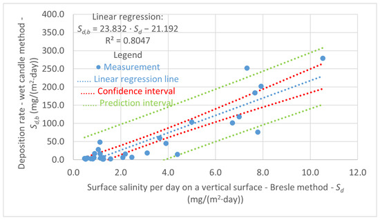 A total of 33 comparable experimental measurements of the average monthly deposition of chloride ions, determined by the wet candle method, and surface salinity, measured by the Bresle method, were analyzed using a linear regression model. The results of this analysis are presented in Figure 9 and also include confidence and prediction intervals.