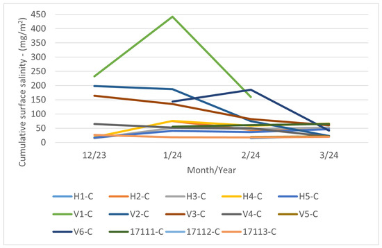 A comparison of Figure 10 and Figure 12 reveals that cumulative measurements of surface salinity are not feasible. The experimental results corresponding to longer exposure periods than one month demonstrate that with prolonged exposure of the surface, including environmental influences (moisture condensation, rainfall, wind action) begin to apply and significantly influence the change in chloride concentration on the monitored surface. In the case of vertically placed samples, natural surface cleansing of the surface by condensed water is likely to be the most applicable process. It is not possible to use surface salinity measurements from long-term exposed surfaces (i.e., exposure longer than one month) to determine chloride deposition rates. This variability is likely due to moisture precipitation on the surface of the cumulative coupon.