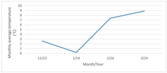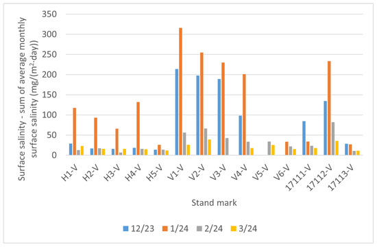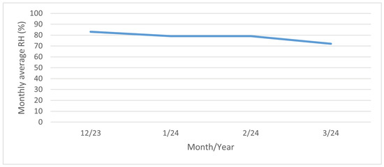 The highest values of the surface salinity (see Figure 11) were observed at every stand in December 2023, and especially in January 2024. This phenomenon can be attributed to fluctuations in temperature and rainfall. When the temperature exceeds 5 °C, road maintenance is not required, as snowfall and frost are not anticipated. The temperature trend during the reporting period is illustrated in Figure 13. In February and March of 2024 there are high temperatures, so the chloride deposition has a decreasing tendency. As the temperature increases, the trend continues to decrease due to the presence of residual chlorides on the road surface as the temperature increases, reaching background chloride deposition typical of summertime. Rainfall also contributes to this trend, but it is more or less constant over the period considered; see Figure 14. Average monthly RH is shown in Figure 15. The average monthly RH values are not significantly different. Additionally, a decline in chloride deposition is evident in the cumulative coupon following the combined effects of washing due to precipitated moisture and cleaning due to wind; see Figure 10.