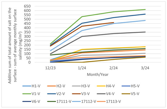 The subsequent sections present the findings of the cumulative long-term coupon and additive sum of the total amount of salt on the surface as an additive approach. For the exact position of each stand, see Figure 2, Figure 3 and Figure 4 or the overview map in Figure 1.