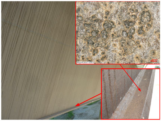 Bridge across the Ostravice river, Czech Republic; photo and detail of the connection of the exterior web plate and bottom slab plate of the box girder; the top surface of the bottom slab of the bridge—magnification 200×, Keyence VHX-7000.
