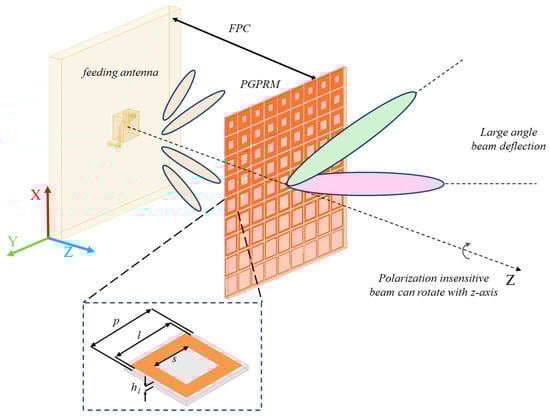 Significant progress has been made in the research of enhancing signal gain and beam deflection over recent years. One effective approach is to utilize metamaterial with a gradient refractive index or high refractive index. This configuration allows the wave to continuously deflect as it propagates through the material, thus altering the direction of the outgoing wave [10,11]. According to Huygens’ principle, metasurfaces with negative refractive indices can also be employed to change the propagation direction of electromagnetic waves [12]. Modal synthesis represents another viable technique for generating tilted beams by combining multiple radiation modes on the aperture of the metasurface [13]. Additionally, metasurfaces designed with different operating states (transmission or reflection state) in different frequency bands can achieve high gain and beam deflection, separately [14]. Furthermore, integrating active devices allows for the management of the states of metasurface units, thereby enabling beam scanning [15,16,17]. The method of combining the Fabry–Perot resonant cavity theory and Phase Gradient Partially Reflective Metasurface to achieve high-gain beam deflection or beam convergence are adopted [18,19,20,21]. On the other hand, for applications in mobile communication and indoor communication, polarization insensitivity are indispensable factors. Most metasurfaces achieve polarization insensitivity by using fully symmetrical units and arrays [22]. Many other promising applications are also conducted creatively through phase-change materials, for example, a metasurface absorber with switchable bandwidth based on the phase-change material vanadium dioxide (VO2) [23].