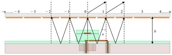 This paper presents a PGPRM antenna based on the FPC theoretical model. The schematic diagram of the PGPRM antenna is shown in Figure 1. The electromagnetic waves radiated by the antenna undergo constructive interference within the Fabry–Perot cavity and are then deflected by the PGPRM upon emission. The schematic diagram of multiple reflections and deflection of electromagnetic waves is shown in Figure 2. The numbers in the figure are unit labels, where represents the loading height of PGPRM. Under ideal conditions, electromagnetic waves are radiated from a radiation source, reflected infinitely in FPC, and then emitted through PGPRM. The electric field strength of the emitted electromagnetic waves is the superposition of multiple reflected electromagnetic waves [27]:
