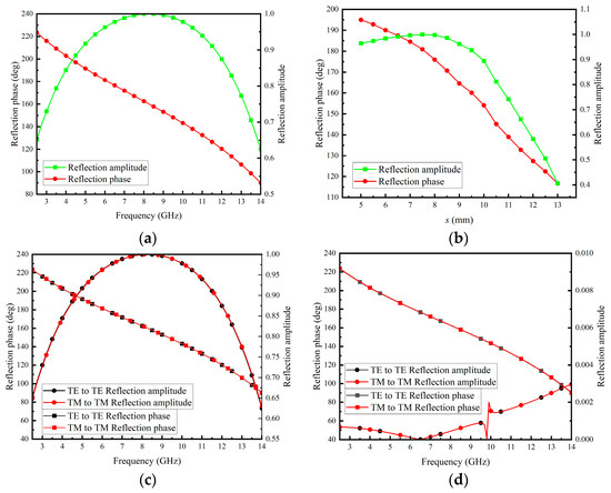 The infinite periodic PGPRM model was simulated in HFSS using the Floquet port. The Floquet port, primarily used for periodic structures, also simplifies boundary conditions with oblique incident wave setup and analysis in non-periodic structures [35]. The model’s reflection characteristic were simulated and analyzed, with the results presented in Figure 3a. The reflection phase of the model decreased with increasing frequency, while the reflection amplitude remained at a high level (>0.6). The center frequency of the PGPRM unit was set at 9 GHz. The influence of the square aperture’s side length s on the reflection characteristic was analyzed, with the results shown in Figure 3b. As the structural parameter s increased, the reflection phase decreased approximately linearly, while the reflection amplitude first increased and then decreased. Thus, the phase gradient between units can be adjusted by varying the parameter s of the PGPRM. Finally, the unit’s polarization characteristic was analyzed. The reflection characteristic and cross-polarization isolation of the model under TE and TM mode states were analyzed separately. The results are presented in Figure 3c,d. The results indicate that the model exhibits polarization insensitivity characteristic and extremely low cross-polarization isolation.
