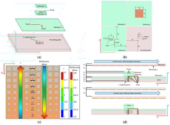 Feeding antennas are critical components in antenna systems. Thus, this paper employs a compact patch antenna with a relatively wide bandwidth [36]. This antenna features dual polarization, allowing the polarization mode to be altered by switching the feeding port. The design of the proposed L-shaped groove patch antenna alongside the PGPRM antenna is illustrated in Figure 4. The structural parameters are detailed in Table 1.