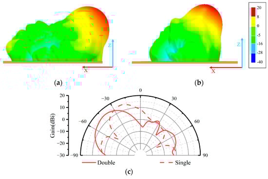 Comparison of simulation results between single-layer PGPRM antenna and double-layer PGPRM antenna. (a) Three-dimensional directional pattern of double-layer PGPRM antenna; (b) three-dimensional directional pattern of single-layer PGPRM antenna; (c) comparison of E-plane directional diagrams.