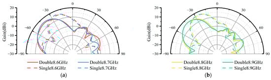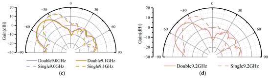 Comparison of directional patterns of PGPRM antenna in the 8.6–9.2 GHz frequency band. (a) At 8.6, 8.7 GHz. (b) At 8.8, 8.9 GHz. (c) At 9.0, 9.1 GHz. (d) At 9.2 GHz.