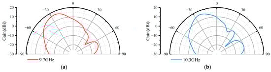 It is noted that our proposed PGPRM unit has broadband high reflectivity characteristic. Therefore, by adjusting the loading height, its gain enhancement and beam deflection capability were tested at different working frequencies. The gain patterns of single-layer PGPRM antenna at half wavelength loading heights of 10 GHz, 11 GHz, 12 GHz, and 13 GHz are shown in Figure 7. As shown in the figure, when the loading height of PGPRM changes, the working frequency of the antenna will also change accordingly. This confirms our speculation that the broadband high reflectivity characteristic of PGPRM can be utilized to achieve gain enhancement and beam deflection in multiple working frequency.
