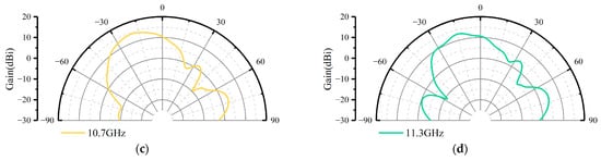 The directional patterns of single-layer PGPRM antenna at different loading heights. (a) At 15 mm, half wavelength of 10 GHz. (b) At 13.6 mm, half wavelength of 11 GHz. (c) At 12.5 mm, half wavelength of 12 GHz. (d) At 11.5 mm, half wavelength of 13 GHz.