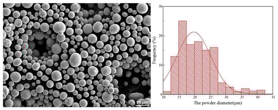 The powder used in this study is Ni45 alloy powder, and its SEM image is depicted in Figure 1 (left). As shown in Figure 1, the powder shape is spherical or ellipsoidal. This shape of the powder ensures the fluidity and continuity of the powder feeding during the laser additive manufacturing process and also makes the powder melt more efficiently. The particle analysis software called Image J (1.54, National Institutes of Health, Bethesda, MD, USA) measure was used to measure the powder diameter. The measured data were mapped, as demonstrated in Figure 1. The particle size distribution of the alloy powder is between 15 μm and 30 μm, and the average size is 24.61 μm. The substrate in this experiment is 45 medium carbon steel (AISI 1045) of 140 × 140 × 10 mm.