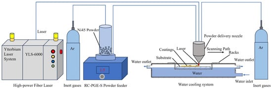 Figure 2 reveals the experimental platform of the laser additive manufacturing system based on a water-cooled substrate, including a water tank, a laser head and its source, the powder feeding system, and the steel substrate. The laser and powder feeding system includes a high-power optical fiber laser YSL-6000 (IPG, Marlborough, MA, USA), an IRB2600 (ABB, Zurich, Switzerland) six-axis robot, and a coaxial focusing powder feeding system RC-PGF-S (Nanjing Zhongke Yu Chen Laser Technology, Nanjing, China). The Ni45 powder is sent to the coaxial powder feeding head preset on the ABB robot for laser additive manufacturing through the coaxial focusing powder feeding system.