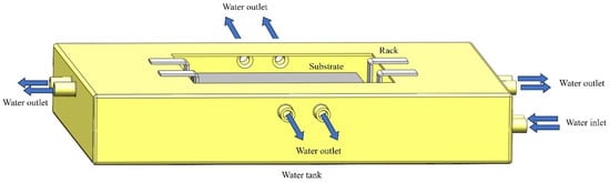 The size of the water cooling system is 350 × 350 × 100 mm, which is composed of a water tank, two racks, two water inlets, and eight outlets. The water tank is welded with 2 mm thick brass. The thin water tank and good thermal conductivity of the brass ensure that the cooling water in the water tank and the outside air is well exchanged during the laser additive manufacturing process. The rack is made of a 2 mm thick 316L stainless steel plate by hot working, which has excellent toughness. It ensures that the substrate undergoes only a relatively small degree of deformation during the laser additive manufacturing process. The substrate was placed on the rack, then the high-pressure water valve opened. Afterward, the cooling water passed from the water valve into the water pipe. The water flow is divided into two streams through the three-way connector and then enters the water tank at the same time to ensure that the water flow entering the water tank is stable. The cooling water in the water tank contacts with the bottom of the substrate after reaching a certain liquid level height. When the liquid level height is higher than the outlet, the cooling water flows out through 8 outlets to obtain a relatively stable liquid level height. Therefore, the lower part of the substrate is subjected to direct contact with the cooling water.