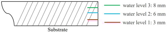 Three different water levels were designed in this study. In the preparation stage of the experiment, the water level lines were engraved on the edge of the three substrates with a knife and a scale. The heights of the three water levels from the substrate were 3 mm, 6 mm, and 8 mm. The relative height of the water level is shown in Figure 4. Employing a volumetric cylinder and a timer, the water output of a single water outlet per unit of time was measured and repeated 10 times, and the average value was finally calculated for precision. Subsequently, the total water velocity was determined for three water levels, 200 mL/s, 500 mL/s, and 700 mL/s. The liquid level height was changed by controlling the water valve. The liquid level coincides with the scale line, and then the liquid level height reflects the velocity of the cooling water.