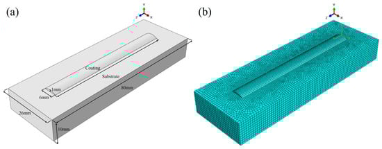 Schematic diagram of the numerical model for laser additive manufacturing: (a) geometric model and (b) finite element analysis meshing.
