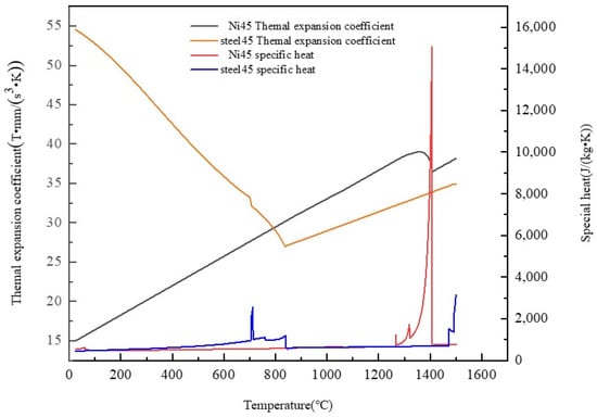 Through the simulation calculation of 45 medium carbon steel and Ni45 alloy by JMat Pro 7.0, the material properties of the substrate and deposition powder with temperature change are obtained, which are shown in Figure 6.