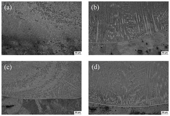 Figure 11 depicts the microstructure of the YOZ cross-section near the interface of coating/substrate at different water velocities. This figure indicates that the cooling rate of the coating gradually increases as the water flow rate increases. The angle between the dendrite growth direction and the fusion line near the weld junction was measured, and the average value was measured three times. The angles at no water cooling condition are 66.834°, while those at the water velocity of 200 mL/s, 500 mL/s, and 700 mL/s are 72.826°, 85.453°, and 87.295°. This means the angle between the dendrite growth direction and the fusion line increases with the increasing water velocity. In Figure 11a,b, it can be observed that the grain size of columnar crystals grown from the fusion line to the center of the coating and secondary dendrites with lateral growth appear when the water cooling is significantly reduced.
