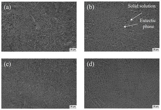 The cooling rate plays an important role in the process of alloy melting and recrystallization, affecting the recrystallization microstructure. Increasing the cooling rate can refine the crystal grain, thereby improving the mechanical properties and thermal stability of the alloy. Wang et al. [18] studied the effect of the cooling rate on the microstructure and mechanical properties of cast Al-Li-Cu-Mg alloy. The results show that the increase in cooling rate refines the grain size and increases the volume fraction of the second phase in the casting. Thus, this improves the tensile properties of the sample. Su et al. [19] investigated the effect of the cooling rate on the microstructure and mechanical properties of M50 steel after the isothermal stage of the vacuum austenite backfired. The results depict that with the increase in cooling rate, the hardness of the austenitic tempered steel increases; however, the hardness of tempered steel decreases. This is related to the formation of martensite and its tempering decomposition. Han et al. [20] fabricated AlCrFe2Ni2 medium entropy alloy (MEA) using L-PBF at different cooling rates by changing the process parameters. The results infer that the cooling rate has a significant effect on the phase composition, microstructure, and mechanical properties. Qin et al. [21] illustrated the relationship between the microstructure of silver copper eutectic alloy and the secondary cooling rate. The results reflect that the cooling rate not only affects the selection of the primary phase and the eutectic lamellar spacing but also affects the mode of the eutectic nucleation and growth.