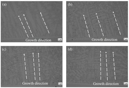 Comparing Figure 9a,b, it can be found that after the application of the water cooling to the substrate, the cellular crystals at the bottom of the coating form columnar crystals that grow straight and regularly toward the center of the molten pool. Comparing Figure 9b,c, it can be concluded that with the increase in the velocity of the water cooling, the size of columnar crystals decreases. In the meanwhile, the number of and the length of secondary dendrites increase significantly. Figure 9b–d illustrate that with the further increase in water cooling velocity, the temperature gradient is larger. Moreover, the growth morphology at the end of small-area cellular crystals tends to form fine dendrites. Figure 9d states that the grain size of the columnar crystal becomes larger when the water velocity increases to 700 mL/s. This is due to the excessive cooling rate of the crystals caused by the excessive water velocity, which makes the growth time of the secondary dendrite to be too short.
