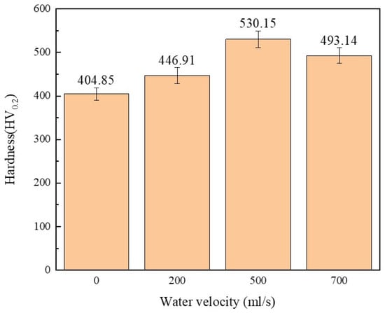 Figure 12 shows the average hardness of the coating at different water velocities. This figure represents that the hardness of the coating obtained by the substrate with water cooling conditions of 200 mL/s and 500 mL/s is higher than the coating obtained by the substrate without water cooling. This is firstly due to the decrease in the dilution rate of the matrix under the water cooling condition, which enhances the solid solution strengthening effect of the alloy elements. Secondly, the water-cooled substrate significantly refined the grain size of the substrate and the coatings, resulting in fine-grain strengthening. According to Yang et al. [33] research, the coating application of the water cooling with a velocity of 700 mL/s to the substrate results in fewer elements of the substrate melting into the coating. Most of the elements of the coating do not dissolve to form carbides and borides such as Cr23C6, Cr7C3, and CrB in the coating to improve the hardness. Moreover, the number of compounds such as NiSi and NiB as hard compounds decreases in the coating, thereby reducing the hardness.