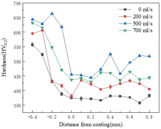 Figure 13 reflects the hardness distribution of the coatings subjected to the water cooling at different velocities. This figure infers that the hardness of the substrate near the interface of the coating/substrate is significantly higher than that of the coating. This is due to the quenching influence of the substrate during the laser cladding process. In addition, due to the application of the water cooling at the bottom of the substrate, the quenching effect is more significant. Compared with the heat-affected zone of the coating without water cooling condition, the average hardness is increased from 474.88 HV0.2 to 638.16 HV0.2, and the hardness is increased by about 34.3%.