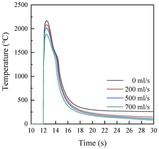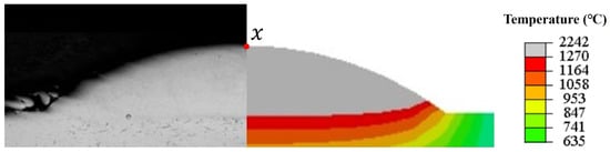 Figure 15 shows the temperature distribution of the coating without the water cooling. It can be seen from this figure that the numerical simulation results of the coating are in good agreement with the macroscopic cross-section in the experiment. The maximum temperatures of the molten pool center of the coating on the substrate without the water cooling and with different velocities of the water cooling are 2242 °C, 2173 °C, 2073 °C, and 1936 °C. The residence time above 1270 °C was 2.608 s, 2.472 s, 2.349 s, and 2.116 s. During the cooling stage, the cooling rate in the center of the molten pool gradually increased with the increase in water velocity. Because the flowing cooling water directly contacts the bottom of the substrate during the laser additive manufacturing process. Consequently, the heat exchange efficiency improves, and the solidification cooling rate of the molten pool accelerates.