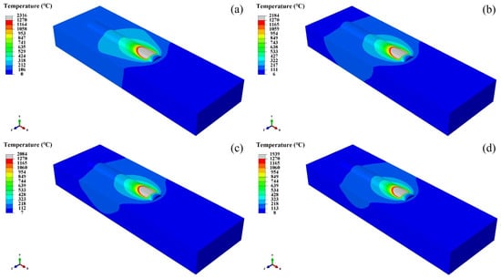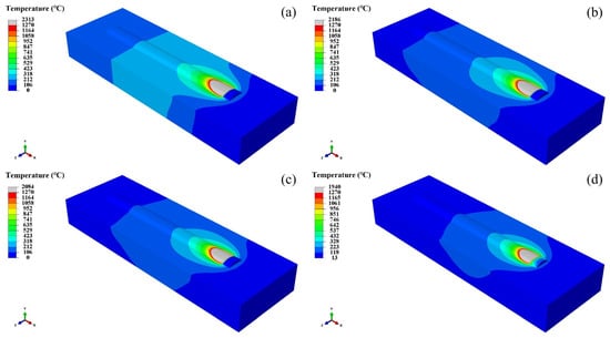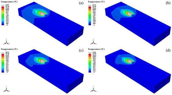 Temperature distribution of coating at 10 s of laser additive manufacturing under different water velocities: (a) 0 m/s, (b) 200 mL/s, (c) 200 mL/s, and (d) 700 mL/s.