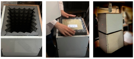 Each sample was centrally placed in the chamber, serving as a barrier between the sound source and the detector. The distance between the sound source and the lower surface of the sample was fixed at 224 mm. The sound intensity was initially recorded without any sample to establish a reference level. The sample was introduced as a barrier, and the sound intensity was measured on the opposite side. Measurements were taken at two frequencies, 1000 Hz and 10,000 Hz. Each test was repeated three times, with the average value reported to ensure precision. To account for the samples’ non-homogeneous thickness and honeycomb design, foam insulators were applied to the cut edges to prevent sound leakage during testing. The sound absorption measurement is demonstrated in Figure 6.