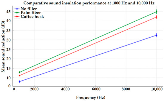 Comparative line graph illustrating the sound insulation performance of different materials (no filler, palm fiber, and coffee husk) at two frequencies, 1000 Hz and 10,000 Hz. The error bars around each point represent data variability and uncertainty at each frequency.