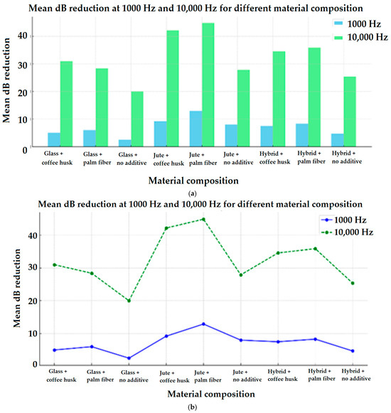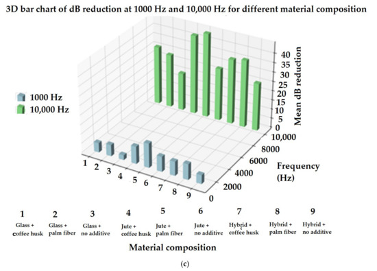 Higher STL values indicate better sound insulation. Sound frequency plays a crucial role in the material’s insulation properties. In this study, sound insulation performance was evaluated at two frequencies, 1000 Hz and 10,000 Hz.