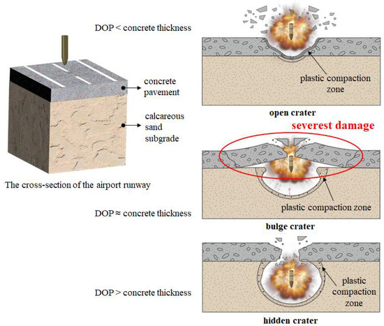 13]. Based on the analysis of the crater characterization, and the mechanism of implosion in the runways obtained from the experiments and simulations, the damage modes of implosion in airfield runways can be classified into three categories: open crater mode, bulge crater mode, and hidden crater mode [