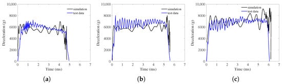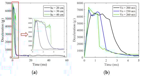 Since the impact velocity and mass of the projectile were constant, the peak of the deceleration curves remained almost unchanged, regardless of the target thickness, although thicker targets led to longer penetration durations. However, the projectile was unable to penetrate the concrete layer at a thickness of 40 cm. Variations in striking velocities resulted in changes to peak deceleration, with higher velocities producing greater peak deceleration values and shorter penetration durations.