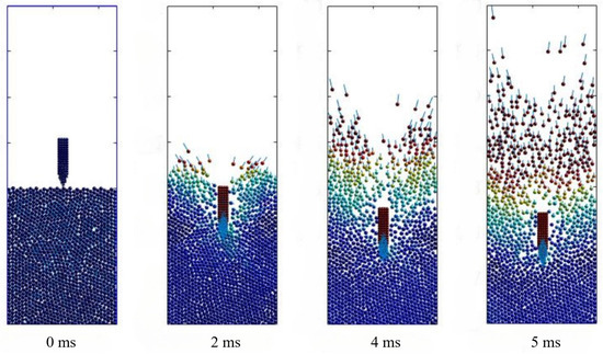 Given the specific characteristics of the reef island airport runway, the penetration process is divided into two distinct phases: the concrete penetration phase and the calcareous sand penetration phase. In this section, the previously validated DEM model was employed to conduct numerical simulations of runway pavement penetration with various striking velocities and concrete thicknesses, with the aim of providing a comprehensive assessment of the airport runway structure under impact.