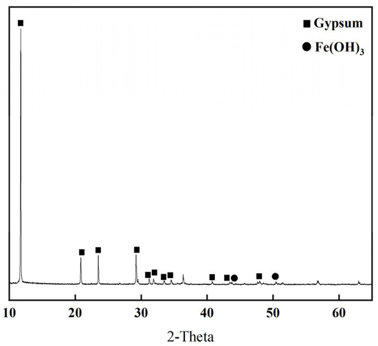Titanium gypsum was obtained from the industrial waste of a local titanium dioxide factory in Ningbo, China. Initially, this TG was a powdery solid, with moisture content fluctuating between 30% and 50%, and exhibited a brownish-yellow or reddish color. For experimental preparation, the TG was subjected to drying, crushing, and screening processes at a low temperature of 50 °C, resulting in a finely powdered form with a specific surface area of 530 m2/kg. As depicted in Figure 1, the XRD analysis identified the predominant crystal phase in the TG as dihydrate gypsum, accompanied by Fe(OH)3 impurities.