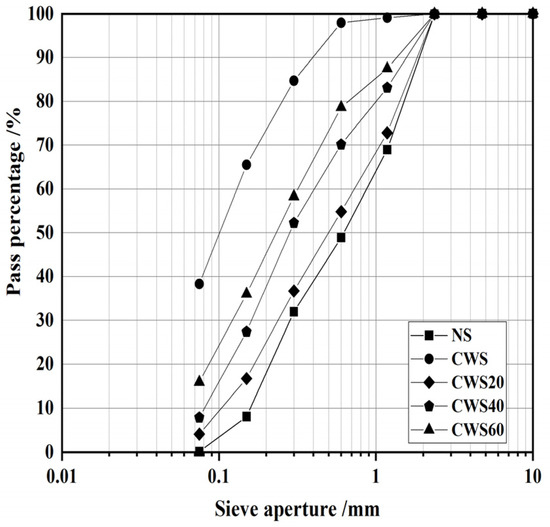 The fine aggregate used in this experiment consists of two components: natural river sand (NS) and CWS. The fineness modulus of the natural river sand that has not been cleaned is 2.42. The CWS was obtained from a construction site in Ningbo, China. The debris, such as tree branches, plastics, and large sized crushed stones, was removed. After being crushed by a jaw crusher and dried at 105 °C until a constant weight was reached, the CWS was prepared for the next step. Subsequently, the CWS was sieved through a 4.75 mm square hole sieve. Table 2 presents the basic physical properties of the CWS. Figure 2 illustrates the cumulative particle size distribution of both the NS and CWS. It is evident that the CWS has a higher proportion of fine particles compared to natural sand. By replacing a portion of the NS with CWS, the particle size distribution of the fine aggregate was altered. Increasing the replacement rate of CWS from 0% to 60% leads to a gradual decrease in the overall particle size of the fine aggregate.