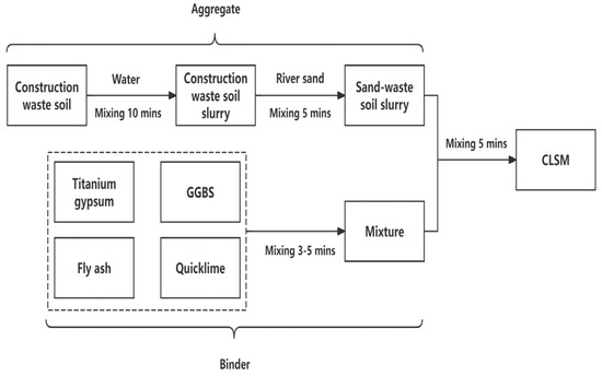 The raw material composition of CLSM resembles that of mortar or general concrete, but it allows for a wider range of binding materials and aggregates with lower quality requirements. It also possesses the ability to incorporate various solid waste materials. Numerous studies have explored the feasibility of using industrial byproducts (such as cement kiln dust, foundry sand, bottom ash, waste glass powder, and wastepaper sludge ash) in CLSM preparation [11,12,13,14]. Additionally, onsite excavated soil is frequently used as an alternative material for CLSM production. Qian and Hu et al. evaluated the performance of CLSM with excess excavation partially replacing sand, revealing that increased soil content resulted in reduced strength, flowability, water stability, and frost resistance, while shrinkage was superior to most cement soils [15]. Sheen and Zhang et al. found that low liquid limit soil-based CLSM exhibited good excavation performance, and the flowability could be enhanced by partially replacing cement with blast furnace slag [16]. Puppala and Chittoori et al. successfully prepared CLSM using high plastic soil for pipe trench backfilling projects, achieving positive economic and environmental outcomes [17]. Based on the aforementioned findings, it can be concluded that incorporating an appropriate proportion of soil into CLSM is entirely feasible.