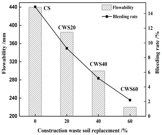 The increase of the replacement rate of CWS as aggregate significantly decreases the flowability of CLSM. Meanwhile, the bleeding rate decreases as well. When the replacement rate is no less than 40%, the bleeding rate can be controlled within 5%. CLSM prepared with a water-to-solid ratio from 0.40 to 0.46 can meet the fluidity requirements. Additionally, the increase in TG content reduces the flowability of CLSM, which is attributed to the relatively low density, large specific surface area, and strong water-absorption properties of TG.