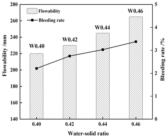 It is observed that when the W/(B + A) increases from 0.4 to 0.46, as shown in Figure 5, both the flowability and bleeding rate of the CLSM increase, which is consistent with the research findings of Zhao, Khadka, and Lee et al. [20,33]. This is due to the fact that the increased water-to-solid ratio exceeds the water consumption required for the hydration reaction of raw materials. The excess mixing water fills the pores between particles and forms a water film on the particle surfaces.
