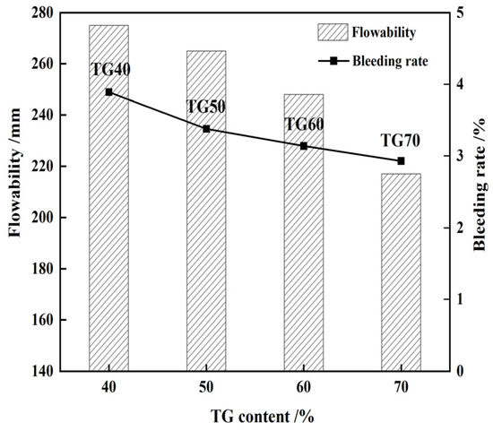 Figure 6. Influence of TG content on the flowability and bleeding rat of CLSM.