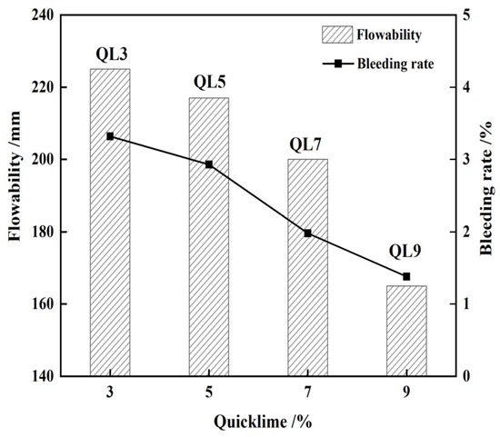 Figure 7. Influence of quick lime content on the flowability and bleeding rat of CLSM.