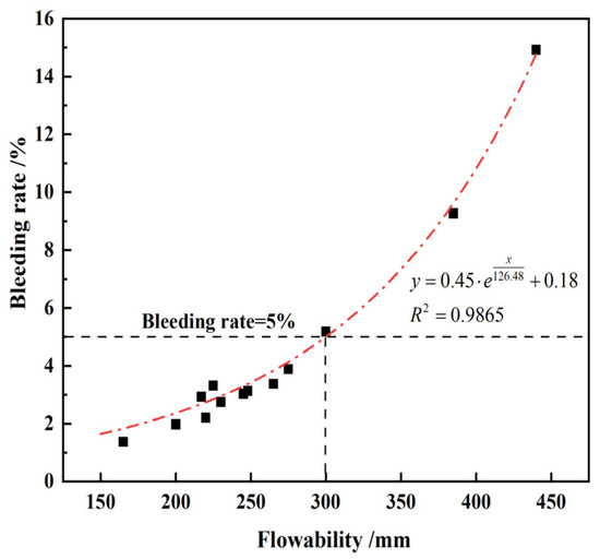 The relationship between bleeding rate and flowability was investigated. The research reveals an approximately positive correlation between them. To ensure that CLSM meets the requirement of a bleeding rate below 5% in practical engineering applications, the upper limit of the flowability should be controlled under 300 mm.