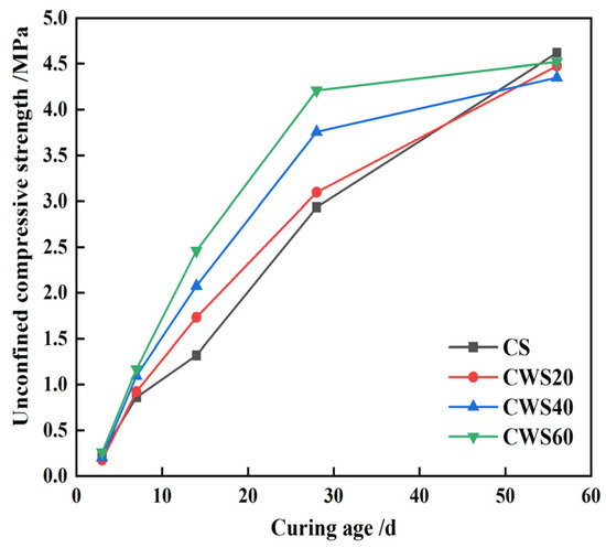 Figure 9. CLSM strength variation characteristics under different replacement rates of CWS.