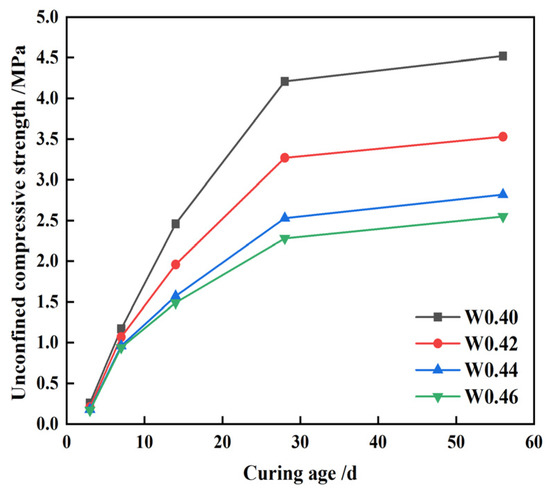 Figure 10. CLSM strength variation characteristics under different water-to-solid ratios.
