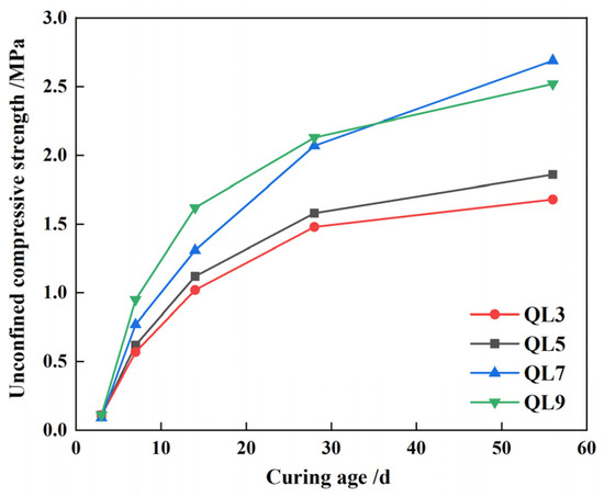 The compressive strength of CLSM at 56 days increases by 0.2, 0.3, 0.6, and 0.4 MPa as quicklime content rises from 3% to 9%, compared to the strength at 28 days. This indicates that higher quicklime content promotes later-stage compressive strength growth by maintaining system alkalinity and ensuring the presence of Ca(OH)2 in the pore solution. This environment supports the continuous dissolution of the glass phase in fly ash and GGBS. At 56 days, samples with 3% and 5% quicklime content show strengths of 1.7 and 1.9 MPa, respectively, with slower growth rates. A compressive strength below 2.0 MPa is advantageous for later secondary excavation, suggesting that quicklime content should not exceed 5%. These findings are illustrated in Figure 12.