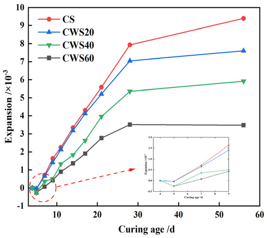 The expansion rate of CLSM decreases as the replacement rate of CWS for natural sand (S/A) increases, as depicted in Figure 13. For instance, CS has an expansion rate of 0.07% at 7 days, increasing to 0.94% at 56 days. In contrast, the expansion rate of CWS60 is negligible at 7 days but reaches 0.35% at 56 days. Moreover, except for CS, the expansion of other samples stabilizes by 28 days. These findings suggest that adding CWS effectively limits the expansion characteristics of CLSM. This effect may be due to the water loss shrinkage of CWS, which reduces the volume expansion caused by ettringite formation during curing.