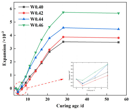 Figure 14 illustrates that the expansion rate of CLSM rises with an increase in the water-to-solid ratio. At a ratio of 0.40, the CLSM shows a 56 day expansion rate of 0.4%. Yet, with an increased ratio of 0.46, the expansion rate escalates to 0.6%, marking an almost 60% increase. This phenomenon occurs because a higher water-to-solid ratio creates more pores in the CLSM, enlarging the spacing between particles and weakening the bonding force within the hardened body. At elevated ratios, the expansion force from hydration, leading to the formation of ettringite and calcium hydroxide crystal, surpasses the bonding force, resulting in increased CLSM volume expansion.