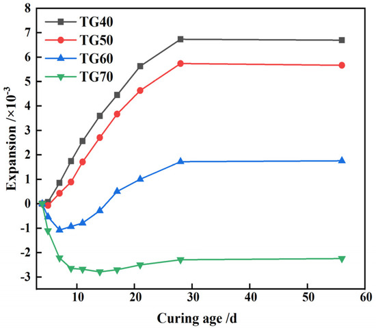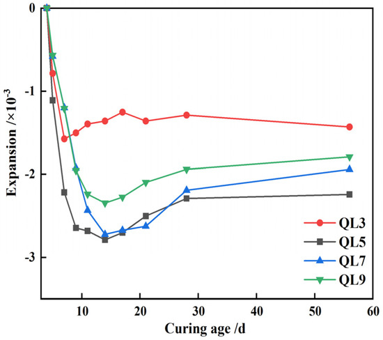 In the volume stability test that was conducted in accordance with the Chinese standard JGJ/T 70-2009 [24], specimens measuring 40 × 40 × 160 mm were utilized. Copper nails were inserted at both ends of the specimens to facilitate the measurement of length changes at time intervals of 4, 5, 7, 9, 11, 14, 17, 21, 28, and 56 days. The measurements were conducted on three sets of parallel specimens to ensure the accuracy and reliability of the test results.