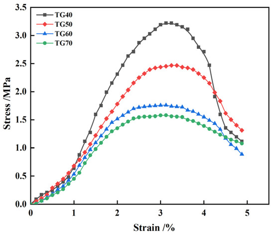 The stress-strain curve can reflect the state of force applied to a material and is the most fundamental index for describing the mechanical properties of a material. Therefore, investigating the stress-strain variation of CLSM under load, as well as the process leading to failure, is highly significant for a thorough understanding of the mechanical properties of CLSM based on TG and CWS. In this section, under the conditions of a fixed lime content of 5% and a water-to-solid ratio of 0.46, stress-strain curves were plotted for samples with different TG contents. By combining the plotted stress-strain curves, an analysis of the stiffness characteristics of CLSM based on TG and CWS was conducted.