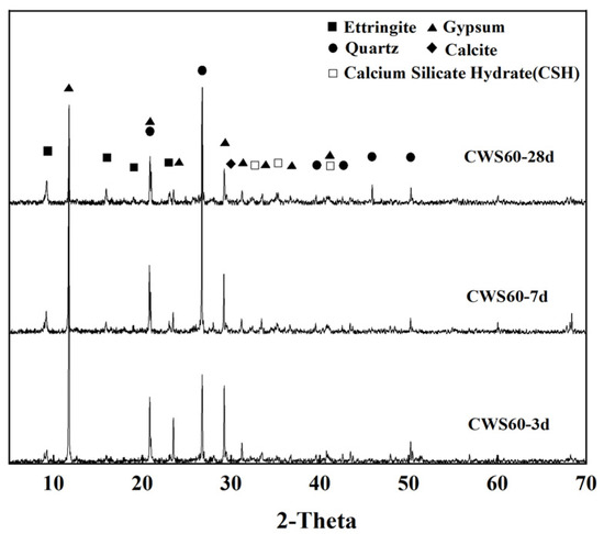 Figure 18 shows the XRD patterns of CWS60, which has superior mechanical properties compared to the other samples, at curing ages of 3, 7, and 28 days. As seen from the figure, the hydration products primarily consist of ettringite, calcium silicate hydrate (C-S-H gel), residual dihydrate gypsum, and quartz introduced with the raw materials. The diffraction peak of ettringite appears as early as 3 days, indicating the formation of ettringite crystals at this stage. The intensity of the ettringite diffraction peak continues to increase with curing time, showing a growth trend even at 28 days of hydration. This suggests that ettringite in CLSM continues to form up to 28 days of hydration.