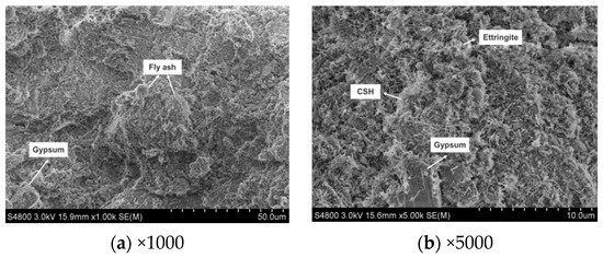 Figure 19, Figure 20 and Figure 21 show the SEM images of the hydration products of CWS60 samples at 3, 7, and 28 days. From Figure 19, at 3 days, the structure appears loose, dominated by calcium silicate hydrate gel and needle-like ettringite crystals. With the increase in the curing age, the glassy phases in mineral powder and fly ash are continuously dissolved and hydrated. Meanwhile, the active colloidal Al2O3 and SiO2 in the clay minerals of CWS will also have chemical reactions with quicklime, generating more calcium silicate hydrate and calcium aluminate hydrate gels.